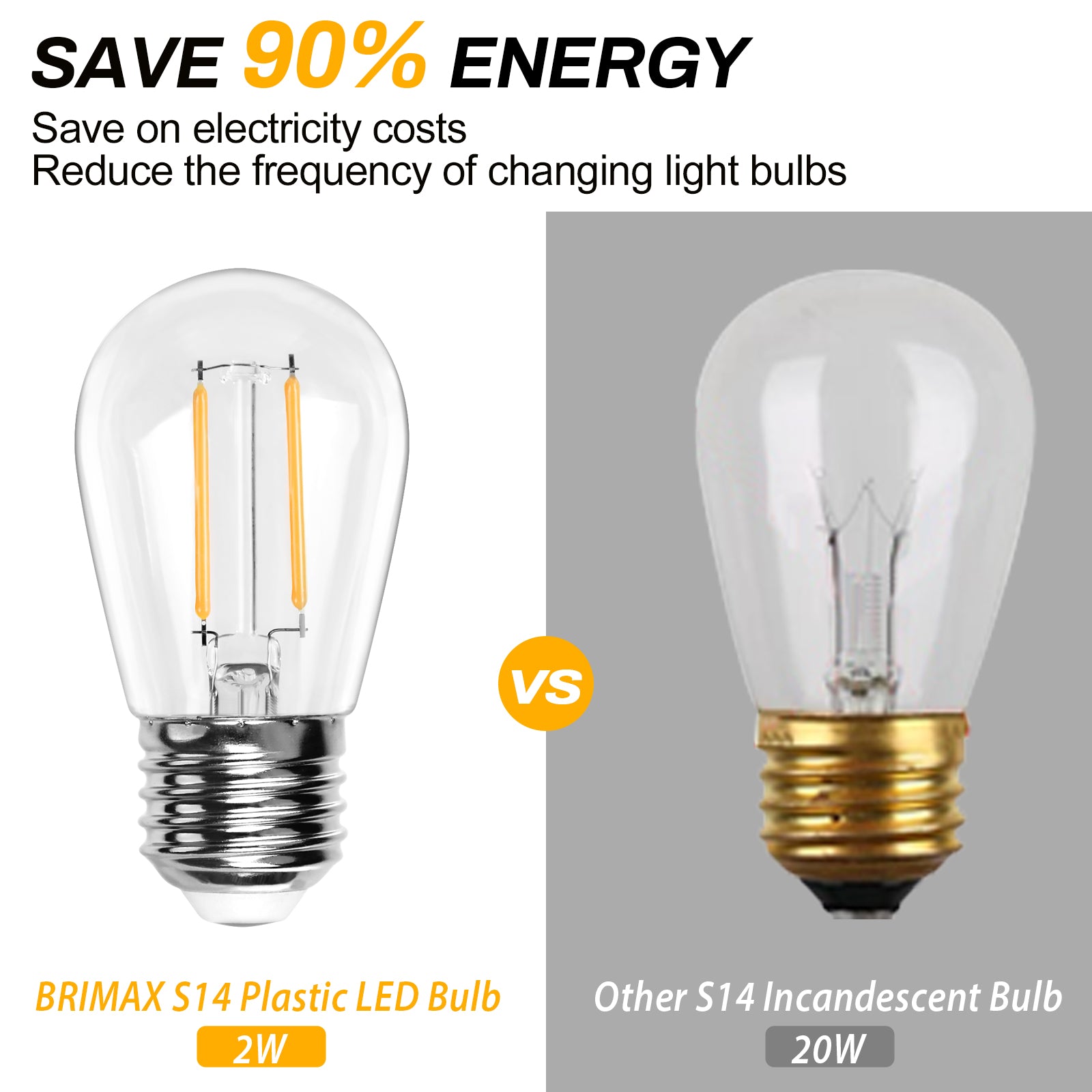 - 💡【Shatterproof & Waterproof】S14 LED light bulb is constructed from high quality clear plastic. The shatterproof and waterproof design is perfect for outdoor string lights.