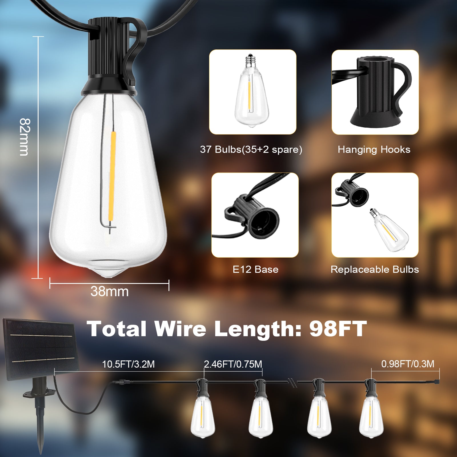 - Premium Solar LED String Lights: Our 30M solar string lights feature upgraded heavy-duty wiring, 39 shatterproof Edison-style bulbs (including 2 spare bulb), and a detachable solar panel. The first bulb is 3.2M from the solar panel, with each subsequent bulb spaced 0.75M apart.