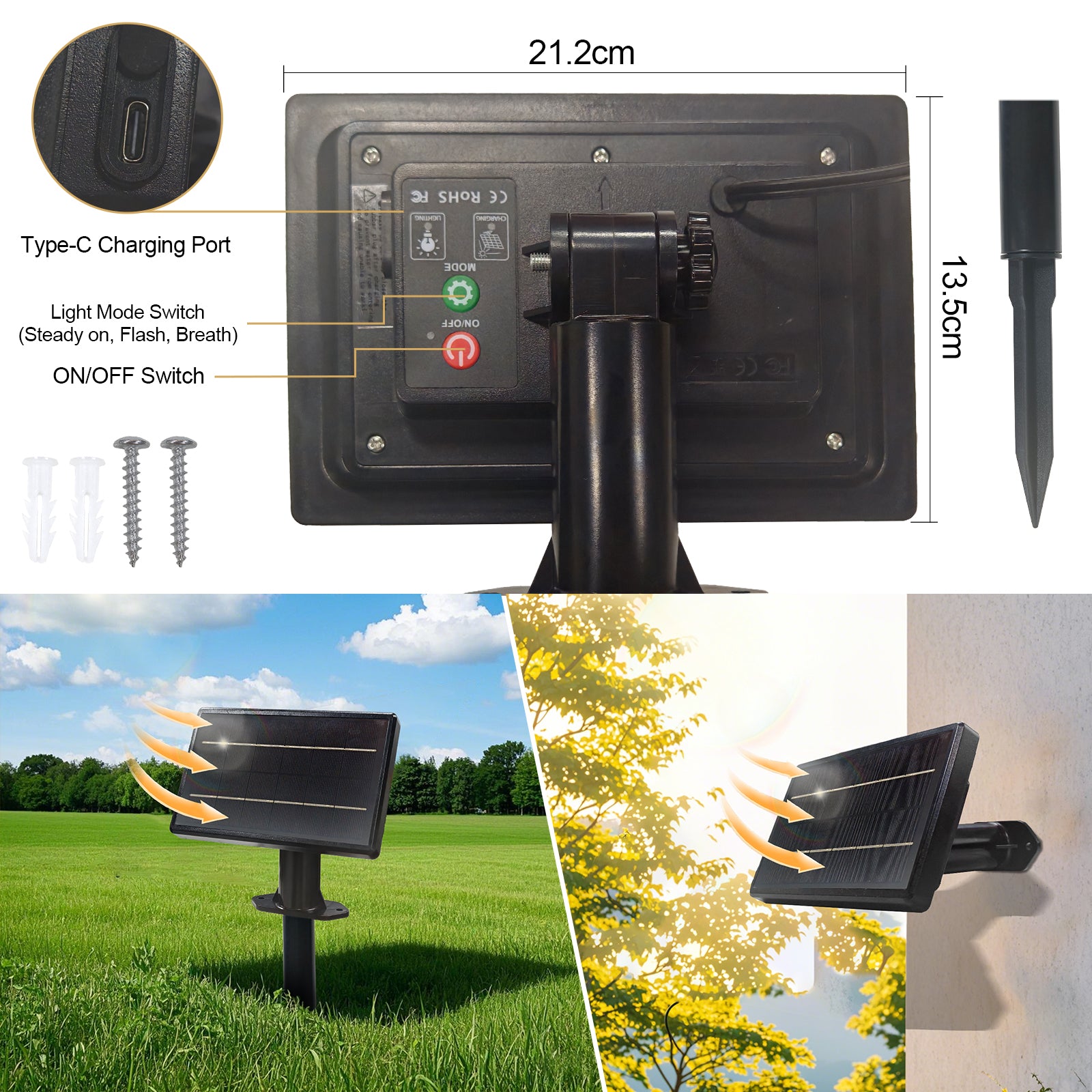 - Zero-Cost Dual Charging Options: These outdoor string lights feature a high-capacity solar panel (3600mAh) that fully charges in 8 hours under sunlight, providing 8-10 hours of operation. On rainy days, they can be conveniently charged via the USB-C port.
